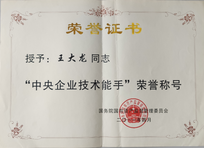 从学校毕业分配到公司,王大龙开启了在企业的成长之路,他秉承着在校期间养成的良好习惯和职业素养,始终坚持刻苦学习、勤于练习、甘于奉献、忠于职责,脚踏实地的干好每一项工作。入职不久,他就凭着不怕吃苦、踏实肯学的工作态度,被选为公司出口国外的硝酸储罐生产项目焊工班成员之一,跟着师傅,他虚心请教学习、休息时间潜心钻研,在项目的完成过程中,他的技能水平得到了大幅度的提升。此后,在国家重视技能人才、公司崇尚技能的支持下,他利用各种闲暇时间提升技能水平、丰富理论知识,不断地磨砺技艺。2010年在哈尔滨建成集团举办的技能竞赛中,成功脱颖而出,取得焊接组第一名,获得代表公司参加中国兵器集团技能大赛的资格,并最终荣获“兵器技术能手”称号;2011年被国务院国有资产监督管理委员会授予“中央企业技术能手”荣誉称号,此后,多次参加公司、行业举办的技能竞赛并取得了优异的成绩;曾荣获嘉克杯国际焊接技能大赛“优秀选手”,“哈南十大工匠”等荣誉称号,多次被公司评为“劳动模范”。