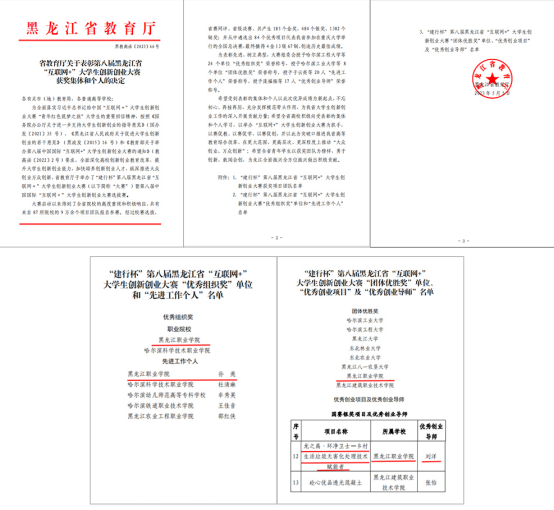 由《关于表彰第八届黑龙江省“互联网+”大学生创新创业大赛获奖集体和个人的决定》(黑教高函[2023]66号)获悉,学校包揽第八届黑龙江省“互联网+”大学生创新创业大赛“优秀组织奖”“团体优胜奖”“优秀创业项目”“先进工作个人”“优秀创业导师”等5项集体和个人表彰,是全省唯一荣获大赛所有集体和个人表彰的高职院校。其中,学院教师刘洋荣获“优秀创业导师”称号。