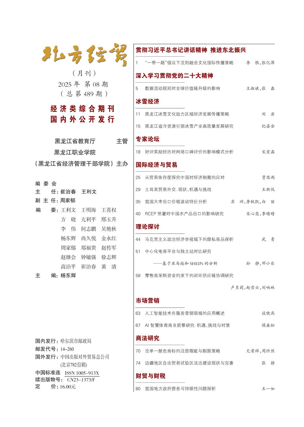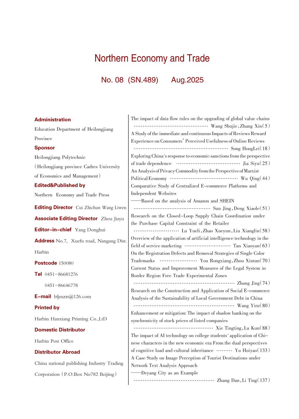 版权所有:北方经贸杂志社 地址:黑龙江省哈尔滨市南岗区学府路5号 邮编150080 电话:0451-86681276 86646778 邮箱:bfjmzzs@126.com