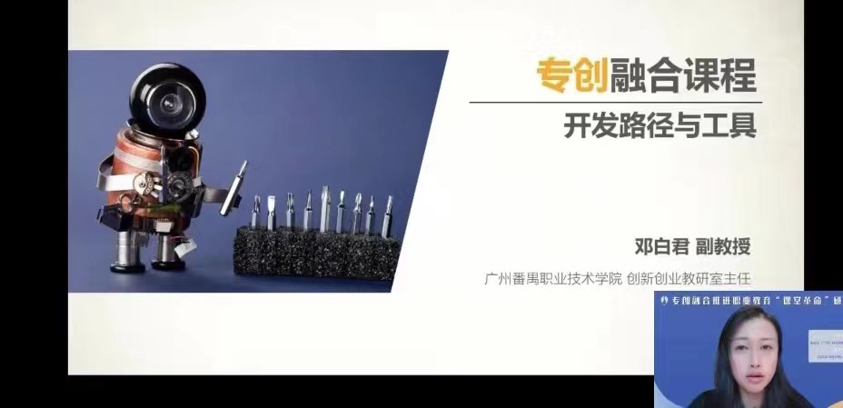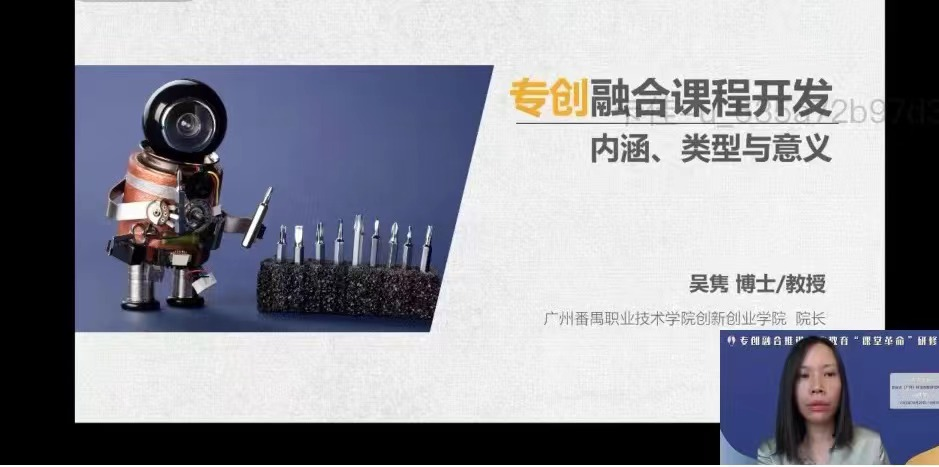 在本次专创融合推进职业教育“课堂革命”线上研修课程中,广州番禺职业技术学院吴隽教授/博士、段娜教授和邓白君副教授/博士三位授课导师,分别从认识、方法和实践三个方面讲授了专创融合课程开发的内涵、呈现与意义;专创融合课程的开发步骤、分析工具;基于专创融合课程教学设计与技巧,实现从0到1开发一门专创融合课程辅导。
