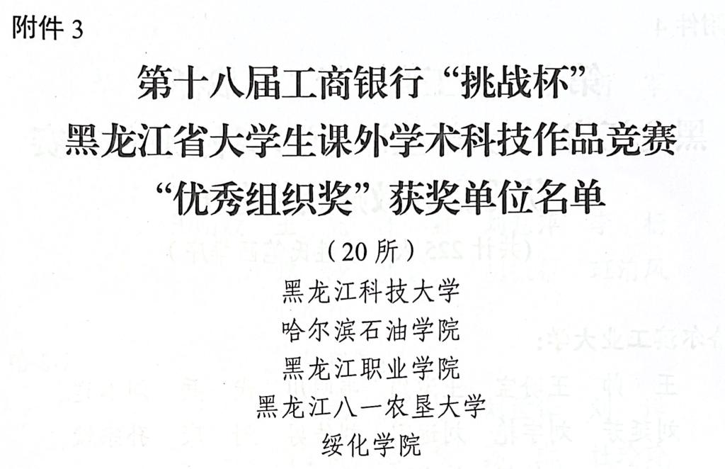喜报—KY开元官网荣获第十八届“挑战杯”黑龙江省大学生课外学术科技作品竞赛优秀组织奖