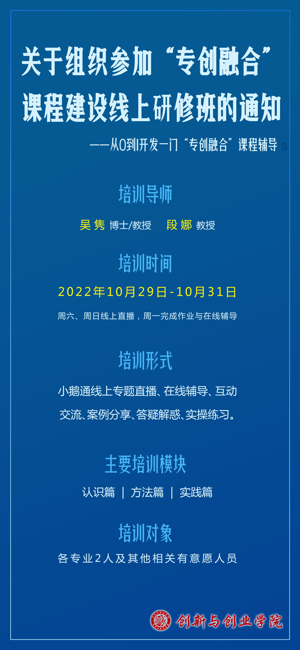 各二级学院每个专业选派2人参加本次“专创融合”线上课程辅导,其他相关人员根据实际情况自行安排。