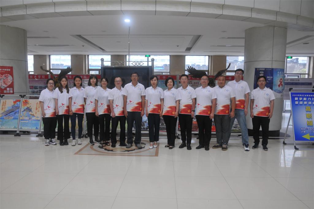 学校承办第九届黑龙江省“互联网+”大学生创新创业大赛“青年红色筑梦之旅”活动期间,创新与创业学院全体教职工在工作现场合影