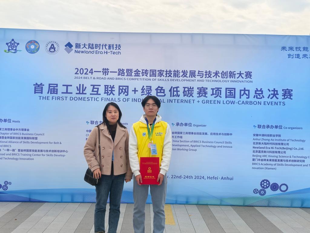 2024年11月23日,一带一路暨金砖国家技能发展与技术创新大赛首届“工业互联网+绿色低碳”赛项国内总决赛在安徽中澳科技职业学院举办。此次大赛吸引了全国52所高职院校的85支参赛队伍,经过线上预赛与线下决赛的激烈比拼,KY开元官网智能制造技术学院董欣教师指导的工业互联网应用专业孙明显同学荣获三等奖。