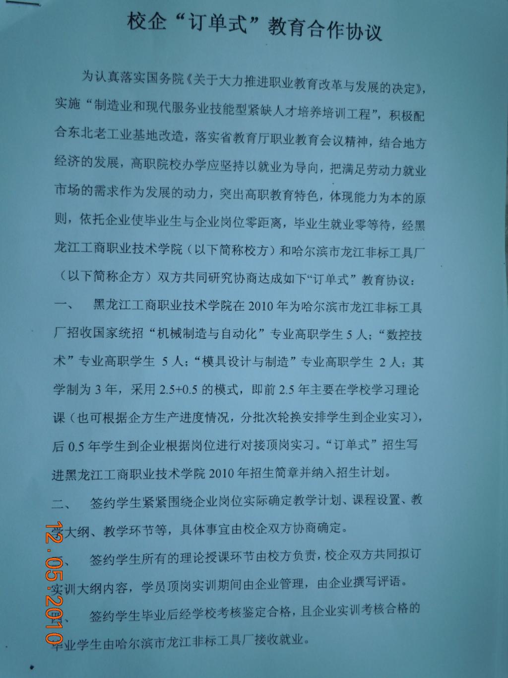 哈尔滨市龙江非标工具厂校企“订单式”教育合作协议