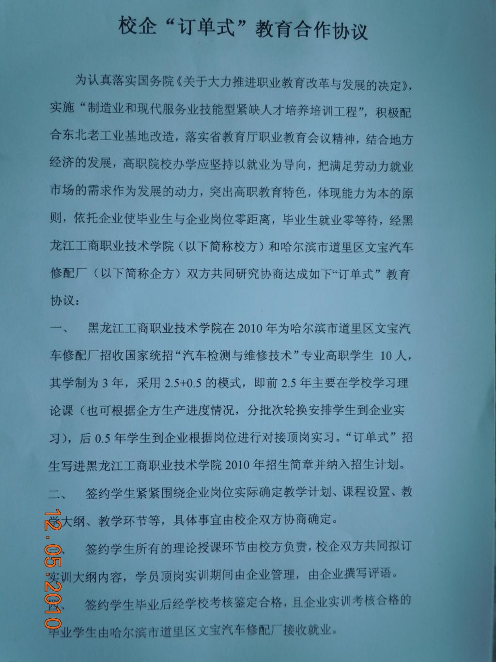 哈尔滨市文宝汽车修配厂校企“订单式”教育合作协议