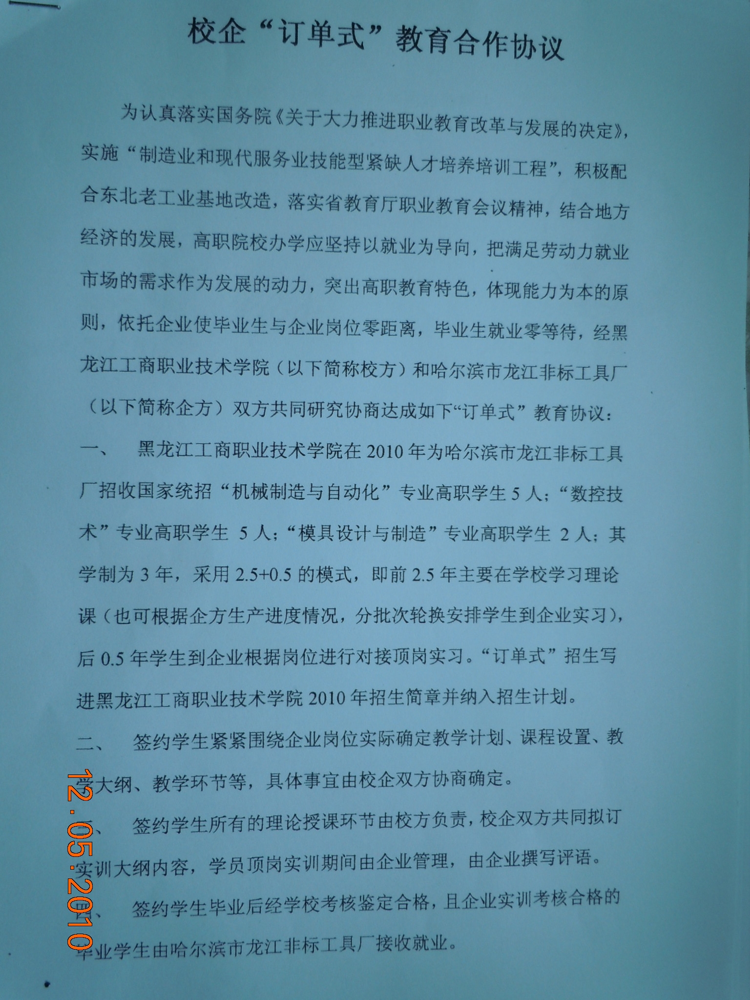 序号 合作单位 1 哈飞集团 2 哈建成机械厂 3 哈尔滨电机厂水电分厂 4 哈尔滨汽轮机厂 5 哈尔滨东安发动机集团 6 牡丹江天合集团 7 哈尔滨鑫北源电站集团 8 哈尔滨建成机械集团 9 三精制药 10 齐齐哈尔二机床 11 黑龙江省农业机械工程科学研究院 12 哈量数控刀具有限公司 13 世一堂集团 14 完达山集团 15 齐齐哈尔一机床