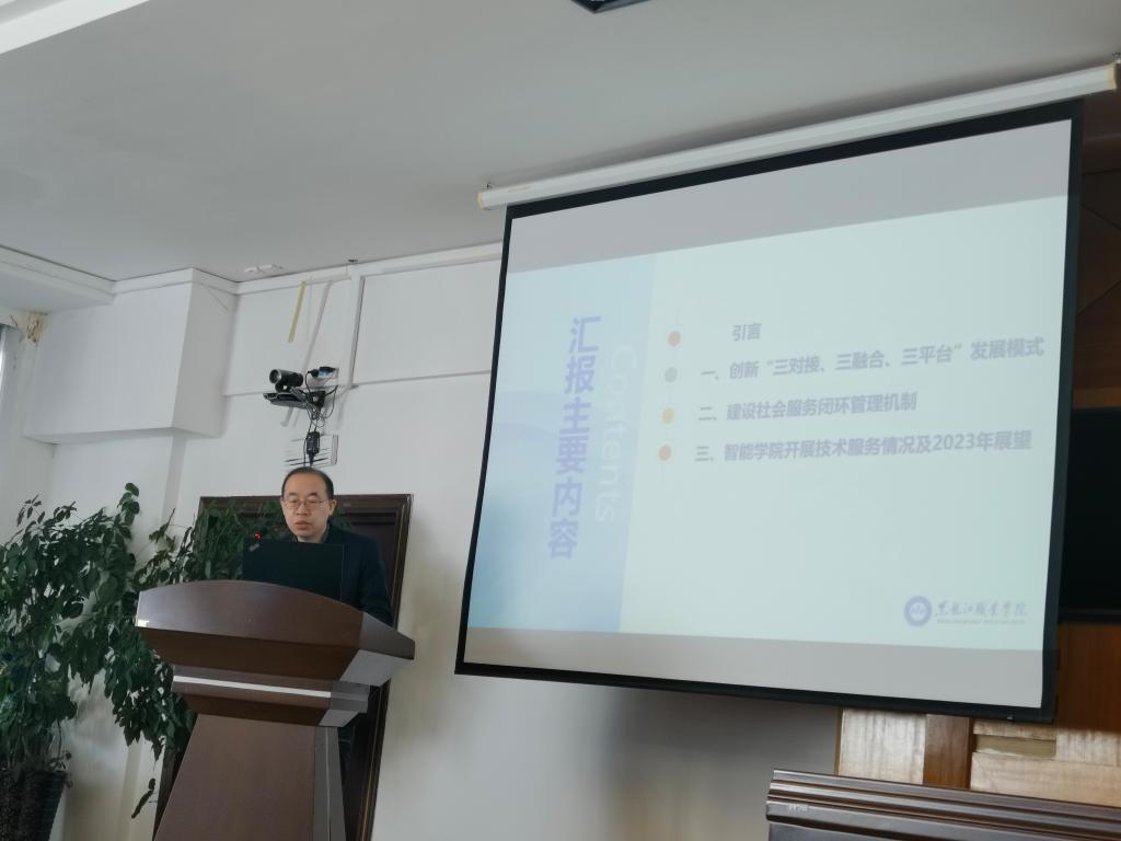 会上,教务处、科研与校企合作处、招生与就业指导处以及5个二级学院代表分别就教学工作、双高建设、招生与就业工作、社会服务工作等内容进行了汇报交流。分院院长李子峰作了《产教深度融合,推动社会服务工作迈上新台阶》的主题发言,他向与会领导介绍了智能制造技术学院面向中小微企业开展技术服务和技术培训工作的思路、实施方法和成效。