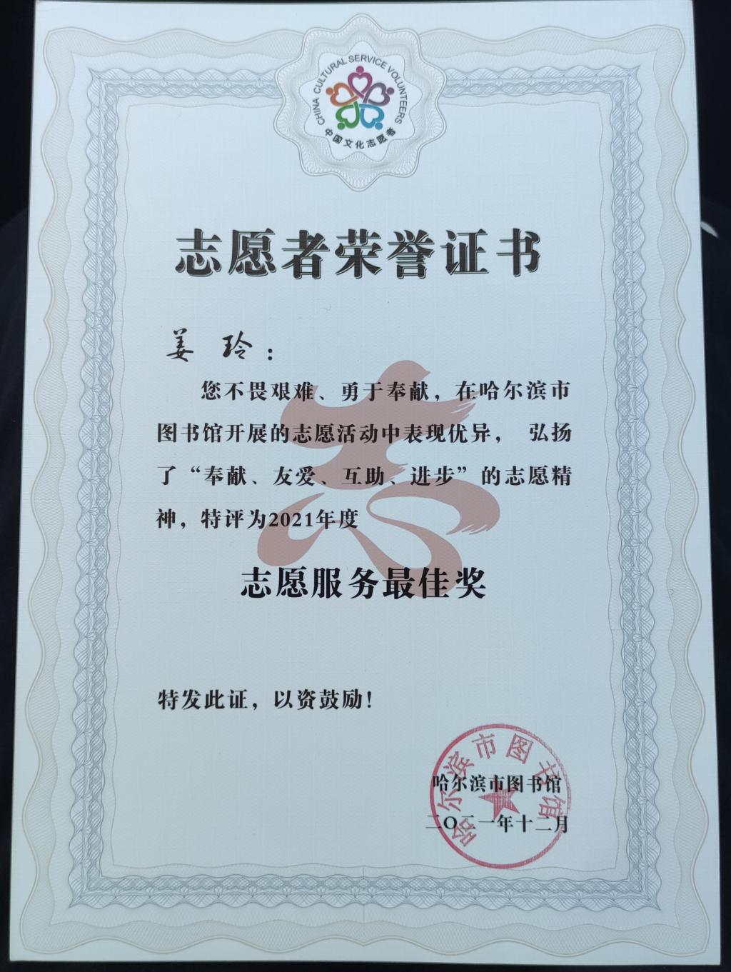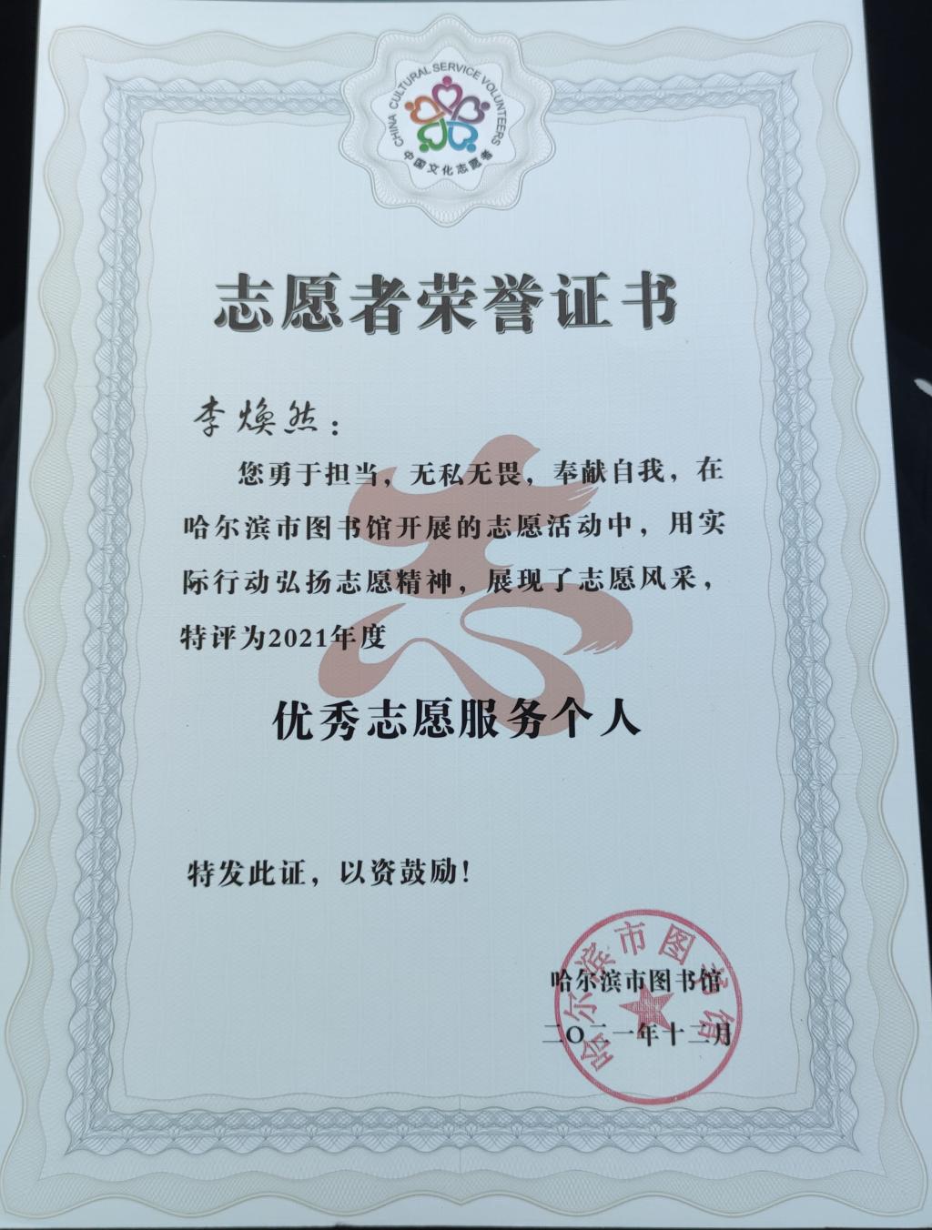 2021年12月10日,哈尔滨市图书馆授予KY开元官网电气工程学院志愿团队“优秀服务志愿团队”称号,同时授予李焕然副院长“优秀志愿服务个人”、姜玲老师“志愿服务最佳奖”的殊荣。