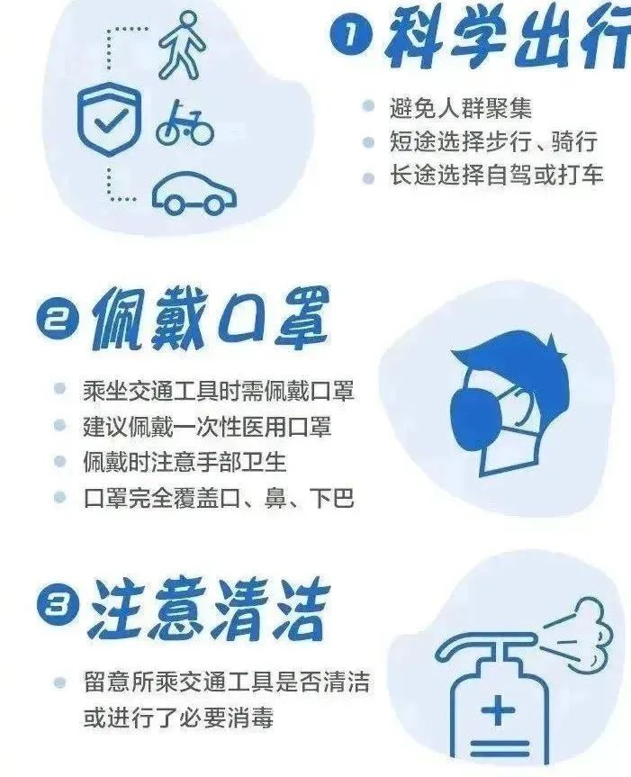 第一,做好个人防护。乘坐公共交通工具时,要全程正确佩戴口罩,减少在公共交通工具上的餐饮时间和次数。保持人际距离,减少聚集。尽量不触摸公共设施,尽量减少在通风不畅场所的停留时间。
