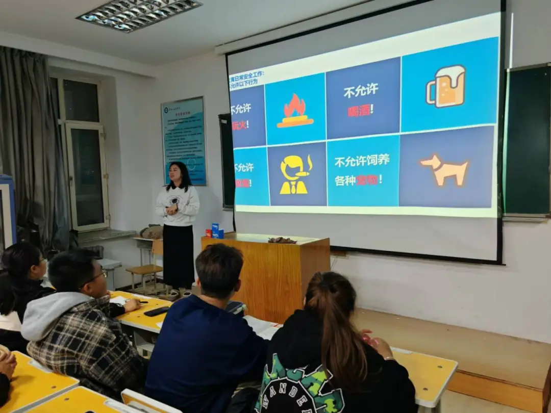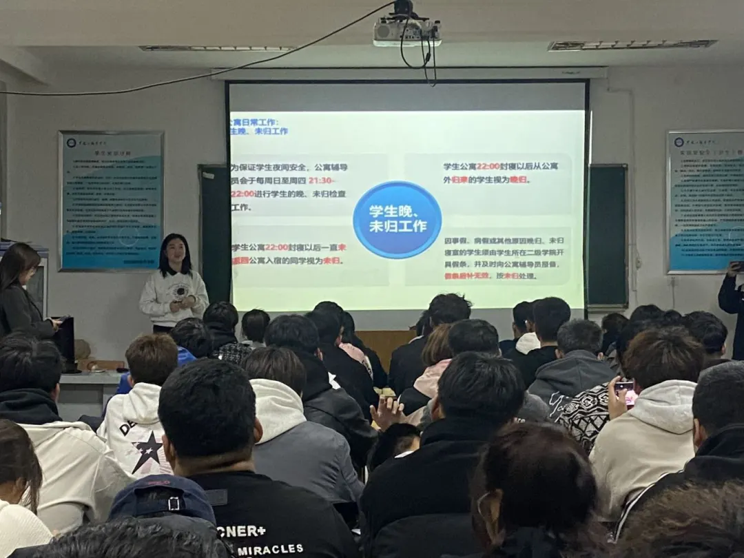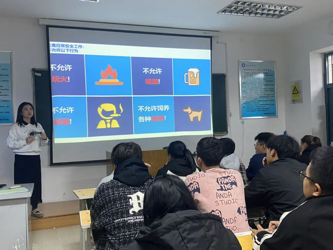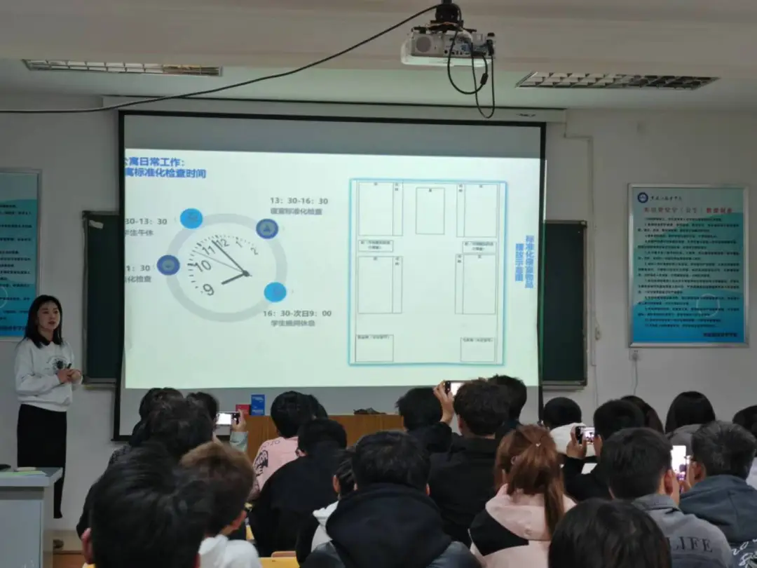 培训期间,张雪婷老师详细讲解了寝室标准化的各项要求,包括物品摆放规范、卫生打扫标准等,让学生们清楚认识到整洁有序的寝室环境不仅能提升生活质量,更是营造良好学习氛围的基础。在安全知识板块,通过真实案例分析,深入浅出地向学生传授了用电安全、防火防盗等重要内容。强调了违规电器的危害以及正确的用电习惯,如离开寝室关闭电源等。同时,还讲解了遭遇火灾等紧急情况时的应对策略。