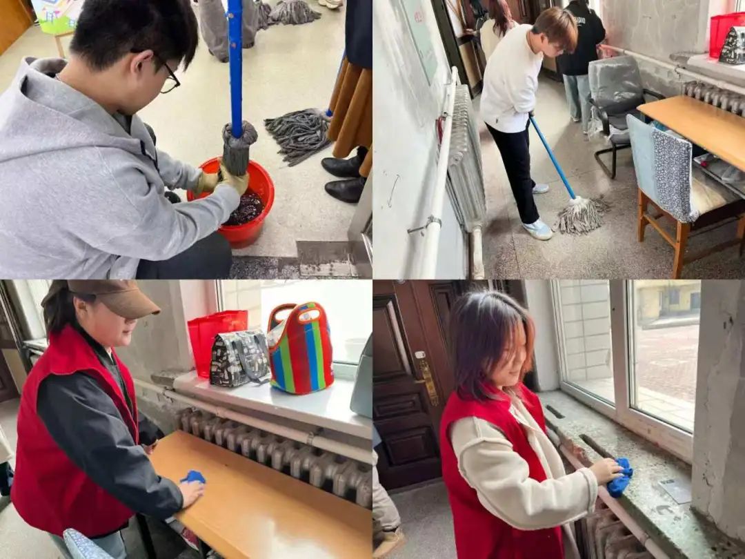 活动开始,志愿者们身穿统一的志愿马甲来到哈尔滨市图书馆,在组织人员的指挥下有序分队并明确清扫任务和清扫区域。他们分工协作,整齐有序地开展清扫活动,包括提水桶,清洗抹布,整理书架,打扫地板等。在图书馆的各个清扫区域,都可以见到志愿者们忙碌的身影。
