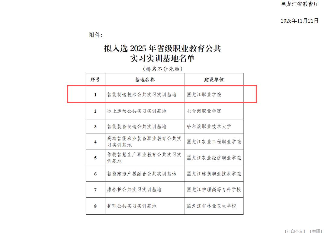 近日,黑龙江省教育厅发布《关于拟入选2025年省级职业教育公共实习实训基地的公示》,分院申报的“智能制造技术公共实习实训基地” 成功入选,标志着在职业教育实践教学基地建设领域再获省级权威认可。