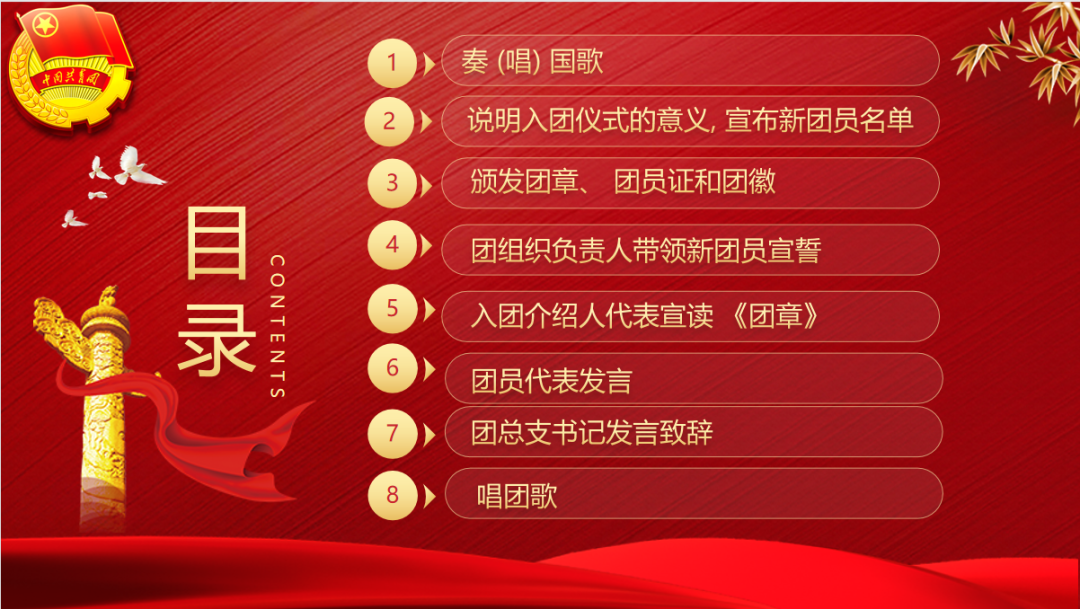 入团仪式共分八项开展,仪式第一项:奏唱国歌;