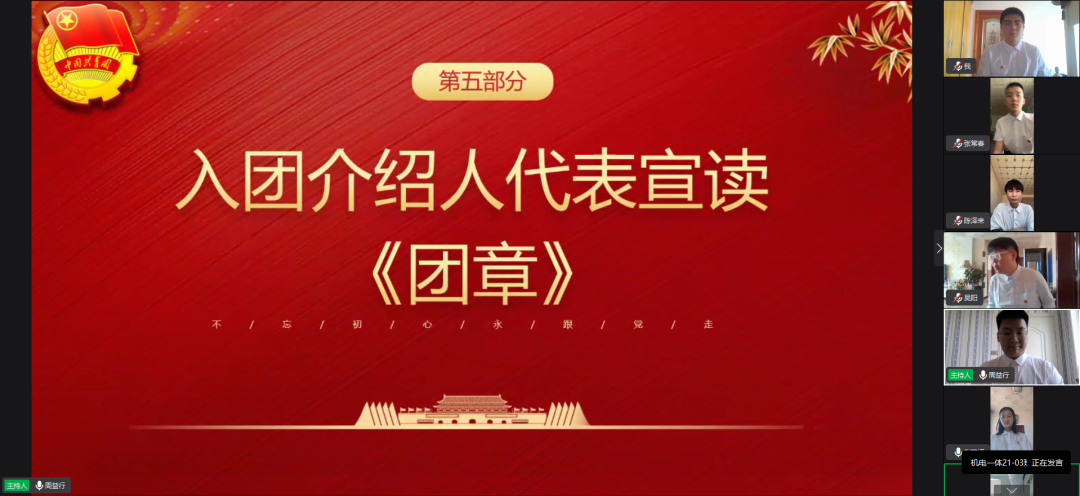 光辉的火炬,唤醒了民族的觉醒,壮丽的事业,激励着我们继往开来。2022年5月8日下午3.00智能制造技术学院团总支举办2022年新团员入团仪式。为大家介绍出席本次入团仪式的人员:党总支副书记李焕然、团总支书记姜玲、21级辅导员孙宇、张学慧、谭延宏、许磊、周利明、团总支学生副书记吴阳、周益行、团员代表陈思睿、大一新发展7名团员。本次入团仪式由团总支学生副书记周益行主持。