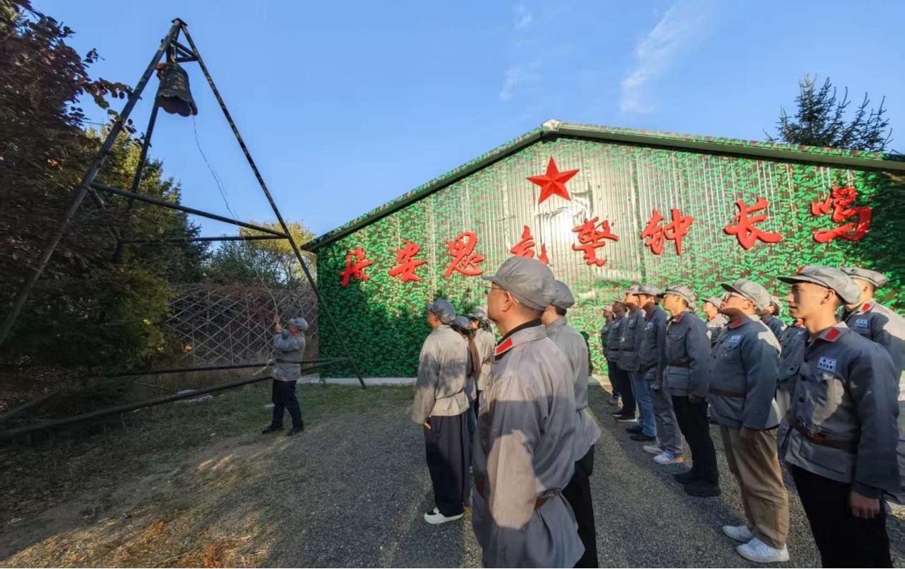 活动特别设置“忆苦思甜”环节,党员和团员们围坐木刻楞营房,吃着玉米饼、咸菜等简朴餐食,聆听教官讲述“一口雪水一口粮”的生存故事。在庄严肃穆的"警钟长鸣"仪式中,十四声钟鸣划破长空,每一声钟响都叩击着一段抗战岁月的记忆。当钟声与《松花江上》的悲怆旋律交织回荡,现场党员和团员们无不凝神肃立,许多人眼眶湿润,泪水悄然滑落。这一刻,历史的厚重与民族的情感在钟声里共鸣,抗联将士"忠诚、担当、血性"的精神通过艺术化的仪式直抵人心。