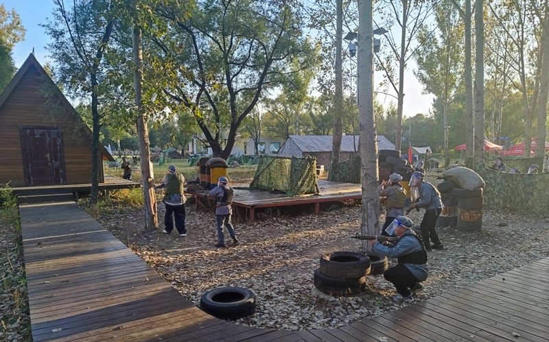 在“重走抗联路”环节,党员们分组完成“抗联西征路”模拟任务,通过“运送军粮”接力、江桥抗战等互动项目,体会抗联战士“火烤胸前暖,风吹背后寒”的战斗环境,通过射箭、手榴弹投掷等军事技能比赛,激发团队协作精神。最后的真人对抗战更将活动推向高潮,青年教师党员表示:“当‘子弹’从耳边呼啸而过时,我才真正理解什么是把一切献给祖国的抗联精神。”