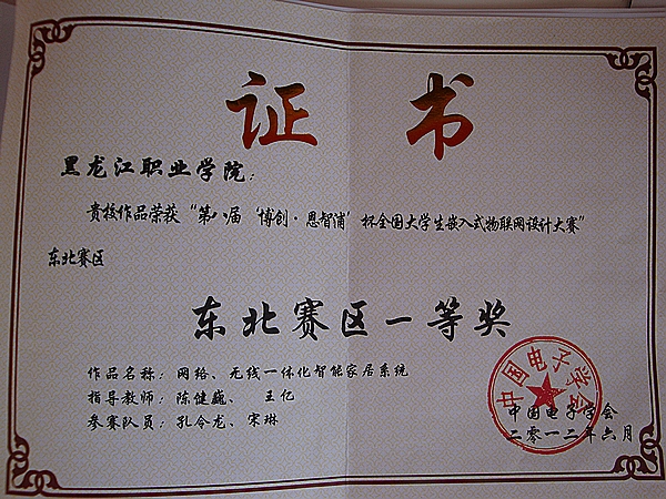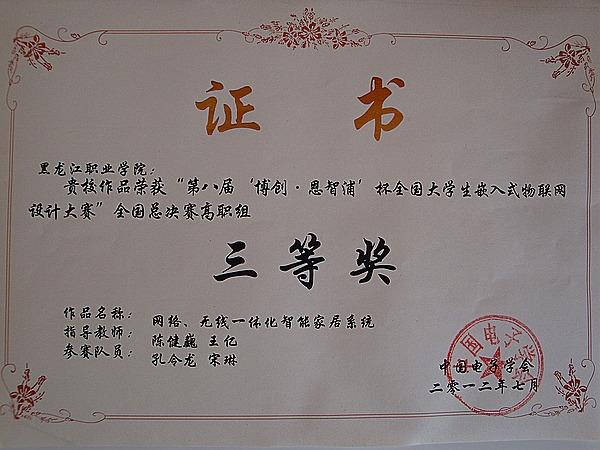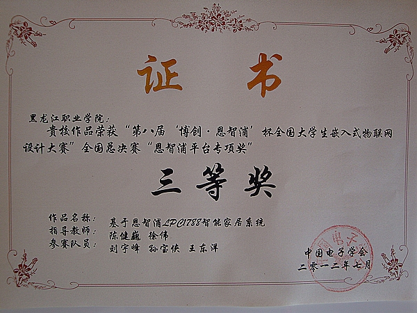 在近三个月的赛前准备中,指导教师和参赛队员克服种种困难,进行设计及调试工作。经过紧张激烈角逐,陈健巍、徐伟、王亿老师指导的刘宇峰、孔令龙和王东洋、孙宝侠、宋琳同学2支参赛队的设计作品分别获得了总决赛三等奖。通过本次大赛,提高了老师的实践教学经验,锻炼了参赛同学专业知识和技能,培养了他们的创新能力、团队精神,提升了我院物联网技术实力和知名度;同时与全国各个知名院校的参赛队进行了嵌入式技术的交流,开阔了视野。