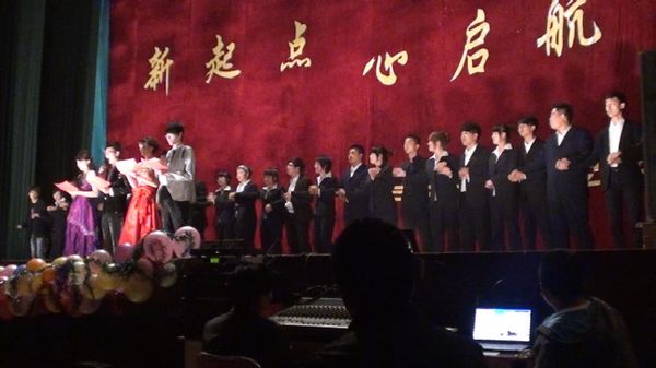 联谊晚会在一场活力四射的开场舞后正式开始,劲歌热舞带给场下观众一片欢腾,表演者与其欢乐互动,小品《他们那点事》使台下观众的欢声笑语接连不断,把整场气氛推向一个高度,辅导员张志勇的一首《亲亲我的宝贝》抚慰了在场的每一位莘莘学子的心,也感动了在场的每一位观众,一束束鲜花簇拥着辅导员,以表达新生学子的感激之情,现场的气氛又一次升温,之后,六个分院主席一起朗诵——《感恩》,让我们学做感恩之人,感恩父母,感恩母校,感恩社会。