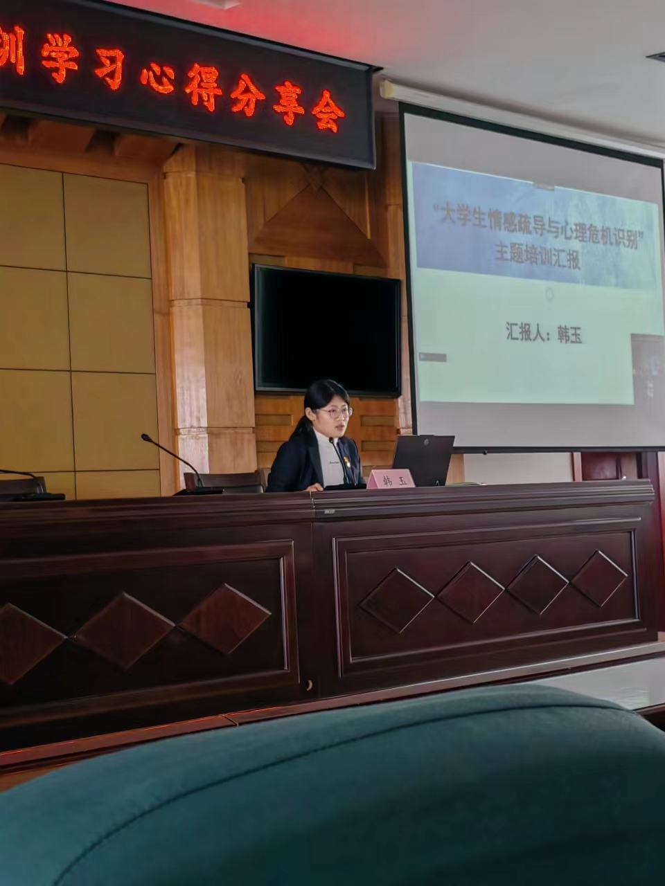 2023年11月9日下午,智能制造技术学院辅导员韩玉以《大学生情感疏导与心理危机识别》为主题,在清华楼九楼经济报告厅为全体辅导员做了一场汇报。此次汇报旨在帮助辅导员缓解大学生心理压力,以及大学生在遇到困难时如何进行心理干预。