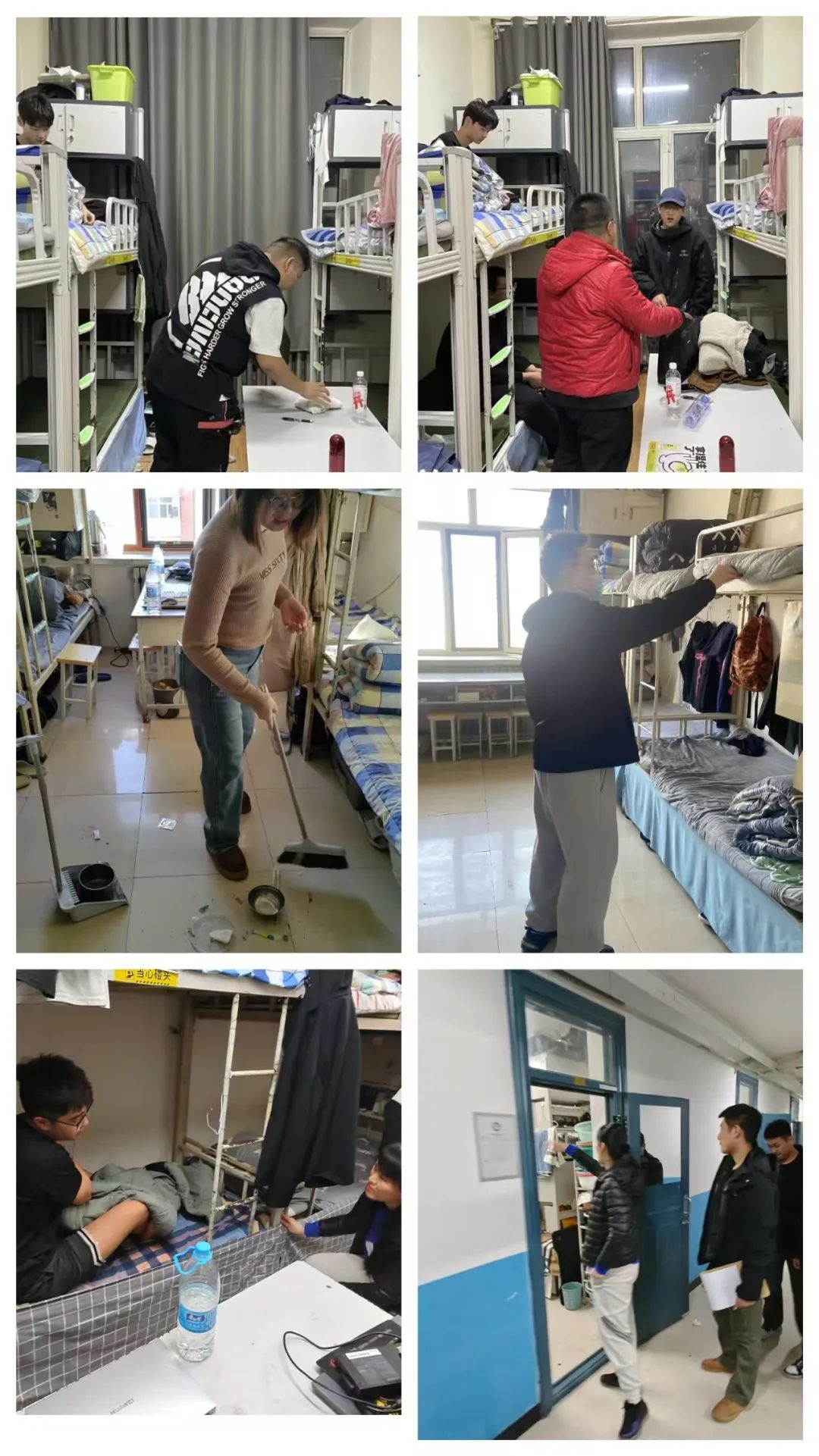 在过程中,王嘉新、邢磊、解恺等辅导员对同学们寝室进行排查,并细心为同学们指出寝室卫生的不足,帮助同学们整理寝室。姜老师带领2023级学生干部对宿舍进行了全覆盖排查,重点检查了用电安全、消防设施、卫生状况以及是否存在违禁物品等问题。针对个别宿舍存在的卫生死角、物品摆放杂乱等问题,现场提出整改意见,并明确责任到人,确保问题及时解决。