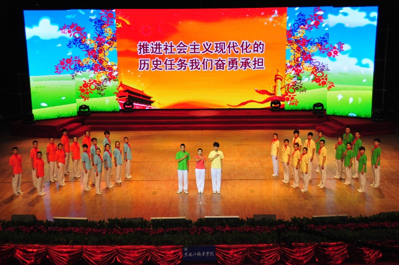 2012年5月16日,哈尔滨会展中心环球剧场装饰一新,门前,两百面校旗、40个悬挂标语的空飘彩球迎风招展,前厅,各级领导、兄弟院校来宾、中外企业代表,中央及省、哈尔滨市各新闻单位记者,以及教师和学生们踏着红地毯,在迎面竖起的巨大签名墙上签名留念。十八块由二级学院、百名教授、百名校友、百家企业的标识构成的宣传展板矗立在红毯两侧,展示学院办学的实力和成就。会前,千余师生观看了学院宣传片,进行了校歌拉唱,喜迎新“龙职”的诞生。