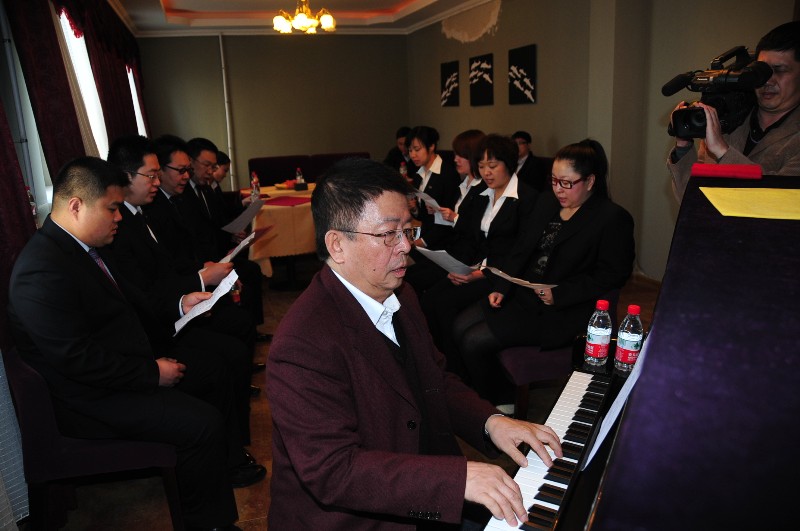 两位卓有成就的词曲作者一起交流、切磋,完成了学院校歌创作。歌词大气、文采飞扬、催人奋进,有着鲜明的时代特征;旋律优美、豪迈、有力,奔向辉煌的明天。作品体现出了很高的思想性、艺术性和文学性,具有很强的艺术表现力和感染力。学院8名教师身着院服,在音乐大师刘锡津教授指导、培训、伴奏下,演唱了校歌,院领导班子成员聆听了演唱,给予了很高的评价。