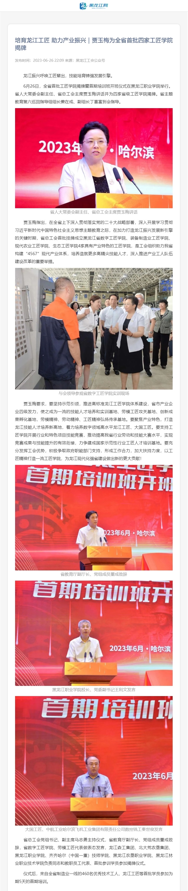 【黑龙江网】培育龙江工匠 助力产业振业|贾玉梅为全省首批四家工匠学院揭牌