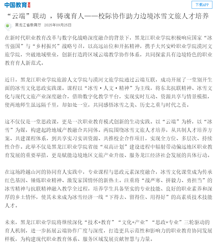 上一篇:【黑龙江网】“云端”联动 ,铸魂育人——校际协作助力边境冰雪文旅人才培养