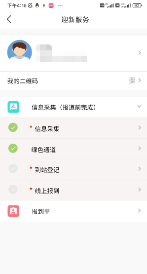 点击后可在迎新服务中选择“移动迎新”进行信息采集(必填)、绿色通道(非必填)、到站登记(必填)、线上报到(必填)等业务的办理。