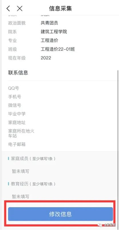 进入信息采集页面后,点击下方编辑按钮进入信息填写页面,信息采集分单项采集和多项采集,其中第一项基本信息中的字段为招生数据同步,无需填写;家庭成员、教育经历、政治面貌信息等采集项为多项采集,多条信息需要多次点击继续添加按钮进行新增,全部维护完成后点击下方的提交按钮提交即可,需要注意的是,信息采集为必须办理环节,如果不进行信息采集,后续环节均无法办理。