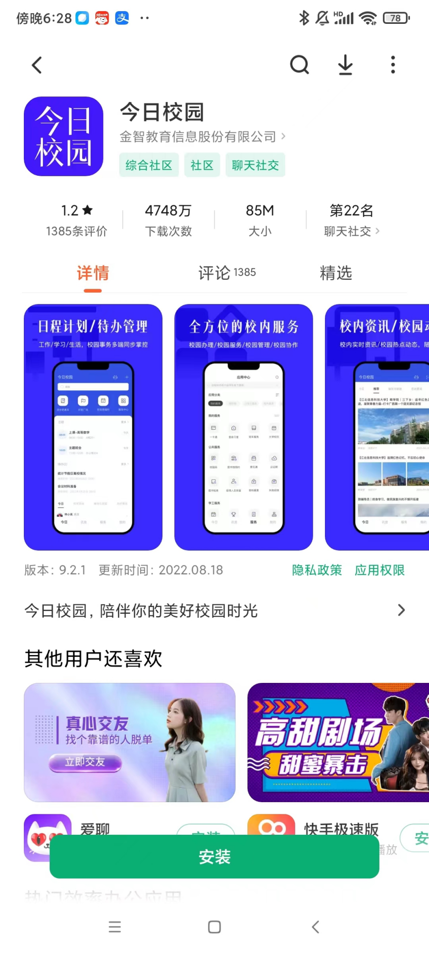 安卓手机登陆应用商店下载“今日校园”