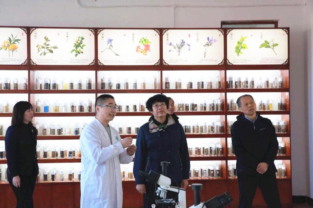 ▲党委书记崔治春走访食品药品学院中药标本室,叮嘱师生要做好中华国粹传承人。