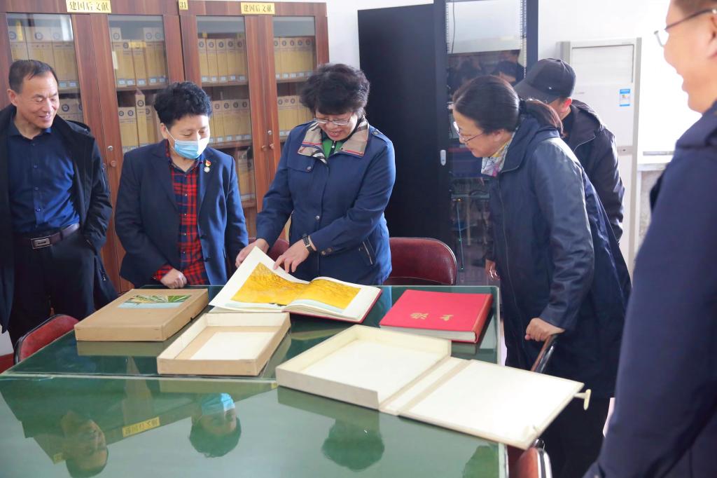 ▲党委书记崔治春走访图书馆特藏室,仔细翻阅建国十周年黑龙江画册。