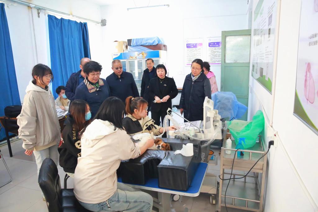 ▲党委书记崔治春走访农牧工程院动物外科手术实训室,询问动物手术实操相关问题。