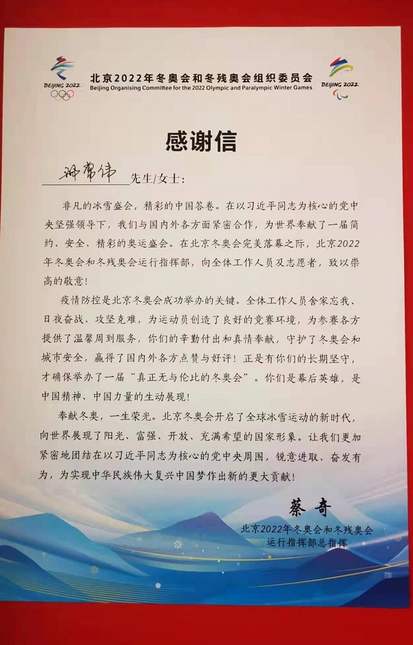 北京冬奥会是全球冰雪运动盛会,更是所有中华儿女共襄盛举、共享荣光的舞台。能够以中国裁判NTO(国内技术官员)的身份出现在冬奥会,是一份认可,更是一份荣誉,邢常伟发自内心地感到自豪!
