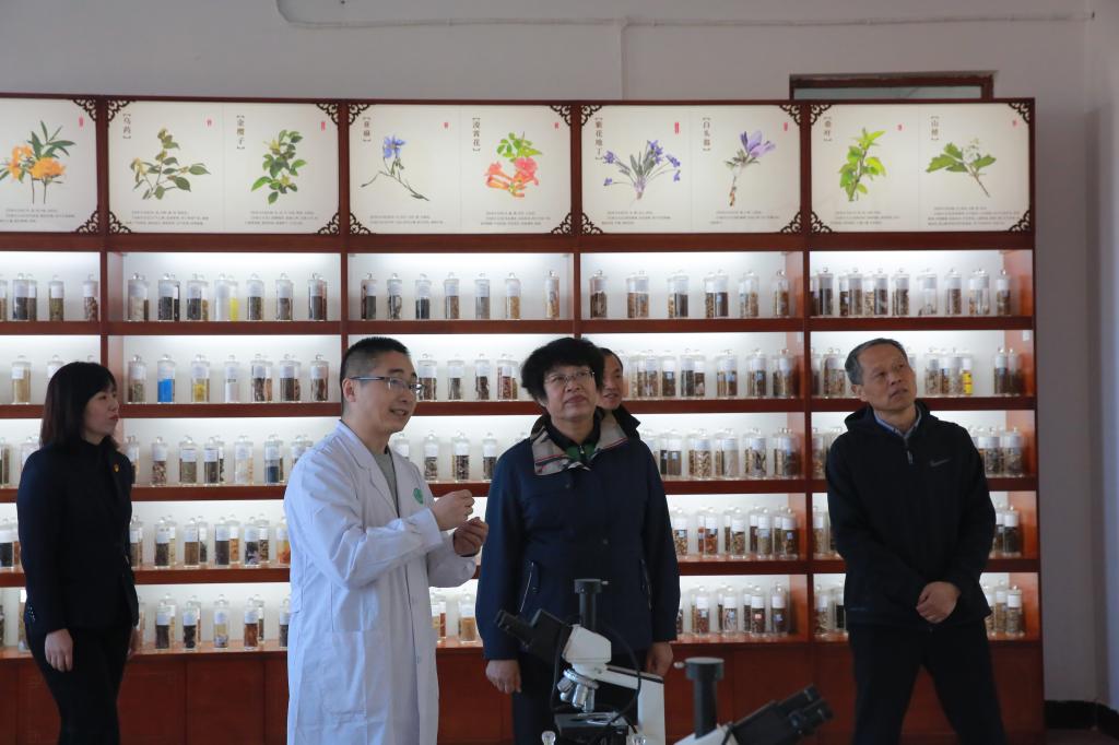 ▲党委书记崔治春了解食品药品学院中药标本室情况