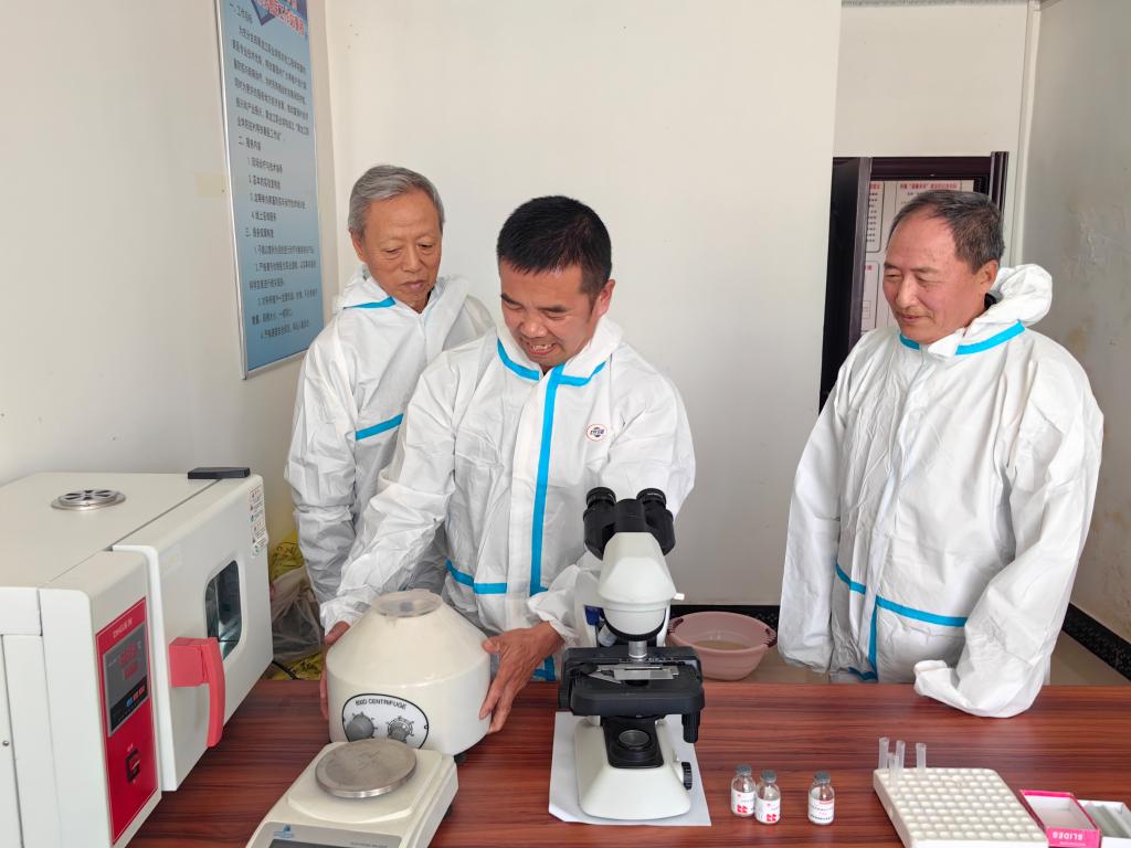 ▲专家与驻村帮扶兽医工作站的郭宏军共同进行血样分析