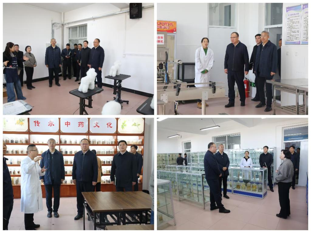 刘启嘉一行参观了校园和中草药标本室、酸乳中试车间、宠物美容护理实训室、病理寄生虫标本室等实习实训场所,详细调研了学校办学历史和专业发展、教育教学、人才培养、科技成果转化等情况。