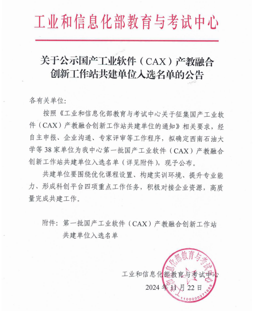 11月25日,工业和信息化部教育与考试中心发布“关于公示国产工业软件(cax)产教融合创新工作站共建单位入选名单的公告”。按照《工业和信息化部教育与考试中心关于征集国产工业软件 (CAX))产教融合创新工作站共建单位的通知》相关要求,经自主申报、企业沟通、专家评审等工作程序,KY开元官网及其他37家单位为第一批国产工业软件(CAX) 产教融合创新工作站共建单位入选名单,其中高职院校共33所。