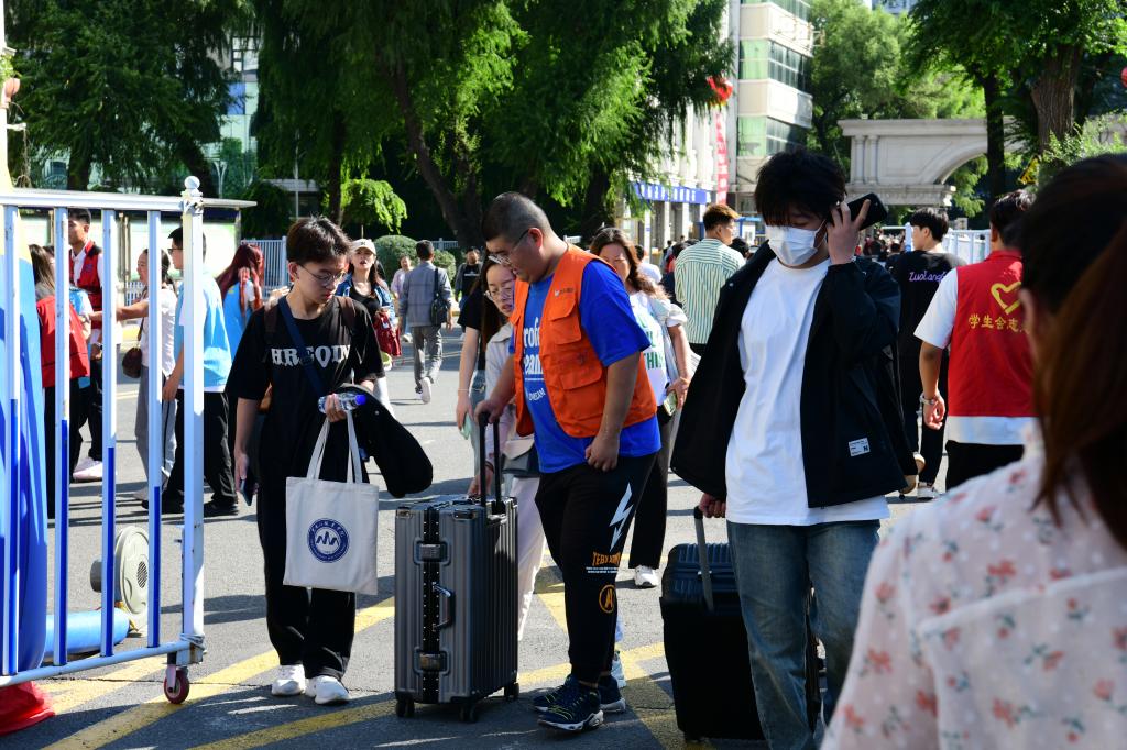 ▲校团委学生志愿者帮助新生搬运行李