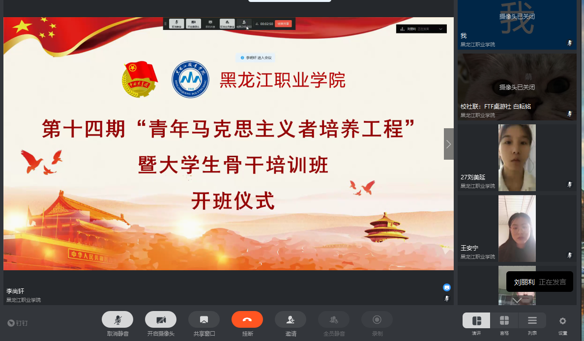 为继续深入实施团中央《“青年马克思主义者培养工程”实施纲要》和《关于各高校积极开展青年马克思主义者培养工程的意见》文件要求,全面加强学生干部队伍建设,强化学生干部在学生组织工作中的模范作用,提高学生组织的吸引力、凝聚力和战斗力。校团委结合当前疫情时期的实际情况,决定举办第十四期“青年马克思主义者培养工程”暨大学生骨干网络培训班,采取线上培训的模式多形式、多角度、分层次、全覆盖扎实推进“青年马克思主义者培养工程”。
