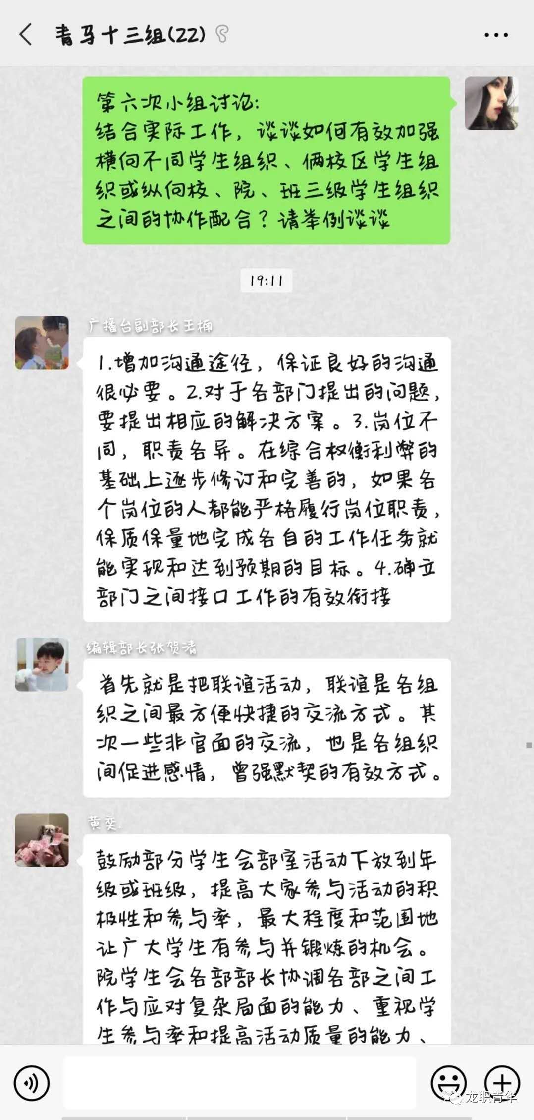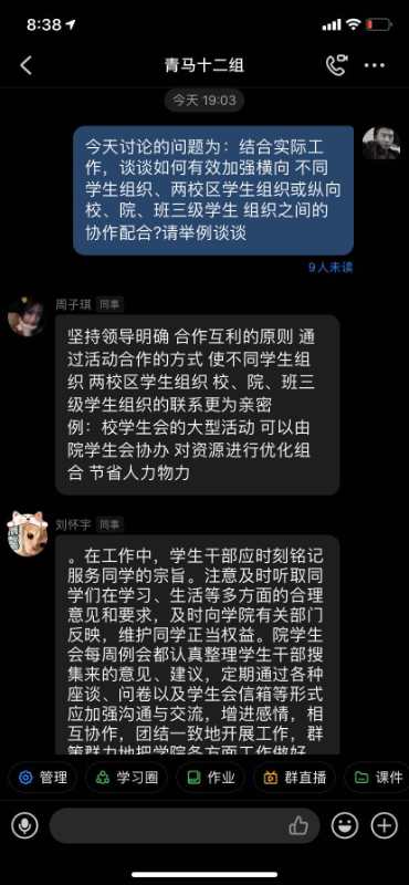 在小组讨论环节中,同学们就“谈谈如何有效加强横向不同学生组织、两校区学生组织或纵向校、院、班三级学生组织之间的协作配合?”展开充分的讨论。同学们纷纷提出看法,定期通过开展各种活动、座谈、问卷以及学生会信箱等形式应加强沟通与交流,增进团队合作默契地开展工作。使学校的各个活动都会开展的有声有色!