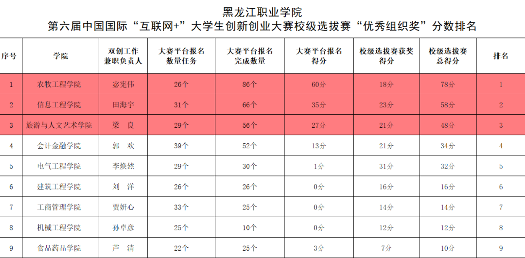 学校第六届“互联网+”大赛校级选拔赛自今年4月启动以来,得到学校领导和各二级学院的高度重视,校党委书记赵继会、校长王利文、党委副书记周家郁多次询问比赛组织过程和进展。通过此次大赛,进一步营造了学校浓厚的创新创业氛围,激发了师生们的“双创”精神,提升了“双创”意识和技能,锤炼了“双创”团队,打造了“双创”项目,为下一步冲刺第六届“互联网+”大学生创新创业大赛省赛和国赛打下了坚实的基础。