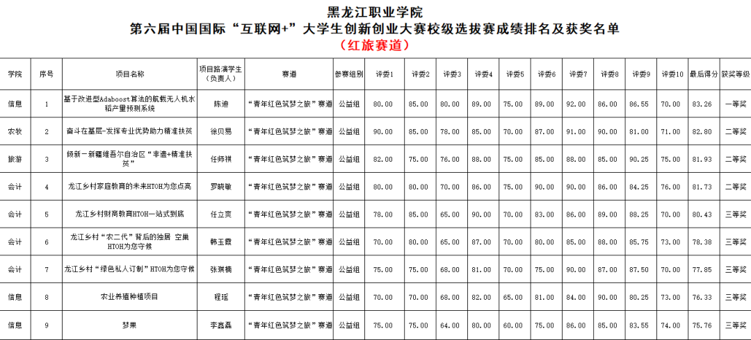 经过各二级学院初赛选拔,全校共遴选53支参赛团队(职教赛道44支、“青年红色筑梦之旅”赛道9支)入围校级决赛,大赛以参赛项目学生负责人PPT投屏陈述展示的形式进行,参赛团队从项目介绍、市场分析及定位、商业模式、营销策略、财务分析及团队介绍等方面进行路演讲解,所有参赛队伍同场竞技、同场排名,每个参赛项目路演5分钟,评委们依据参赛选手在路演中所凸显的优势和存在的问题进行云端打分。大赛项目涵盖了“互联网+”制造业、信息技术服务、商务服务、公共服务、公益创业、文化创意服务、绿色兴农、电商兴农、教育兴农等各个领域。经过长达5个小时的激烈角逐,大赛最终评比产生职教赛道创意组一等奖5名、二等奖8名、三等奖10名和优秀奖15名,职教赛道创业组优秀奖1名;“青年红色筑梦之旅”赛道公益组一等奖1名、二等奖3名和三等奖5名。农牧工程学院、信息工程学院、旅游与人文艺术学院三个学院分别荣获校赛“优秀组织奖单位”;农牧工程学院宓宪伟、信息工程学院田海宇、旅游与人文艺术学院梁良三位老师分别荣获校赛“优秀工作个人奖”。