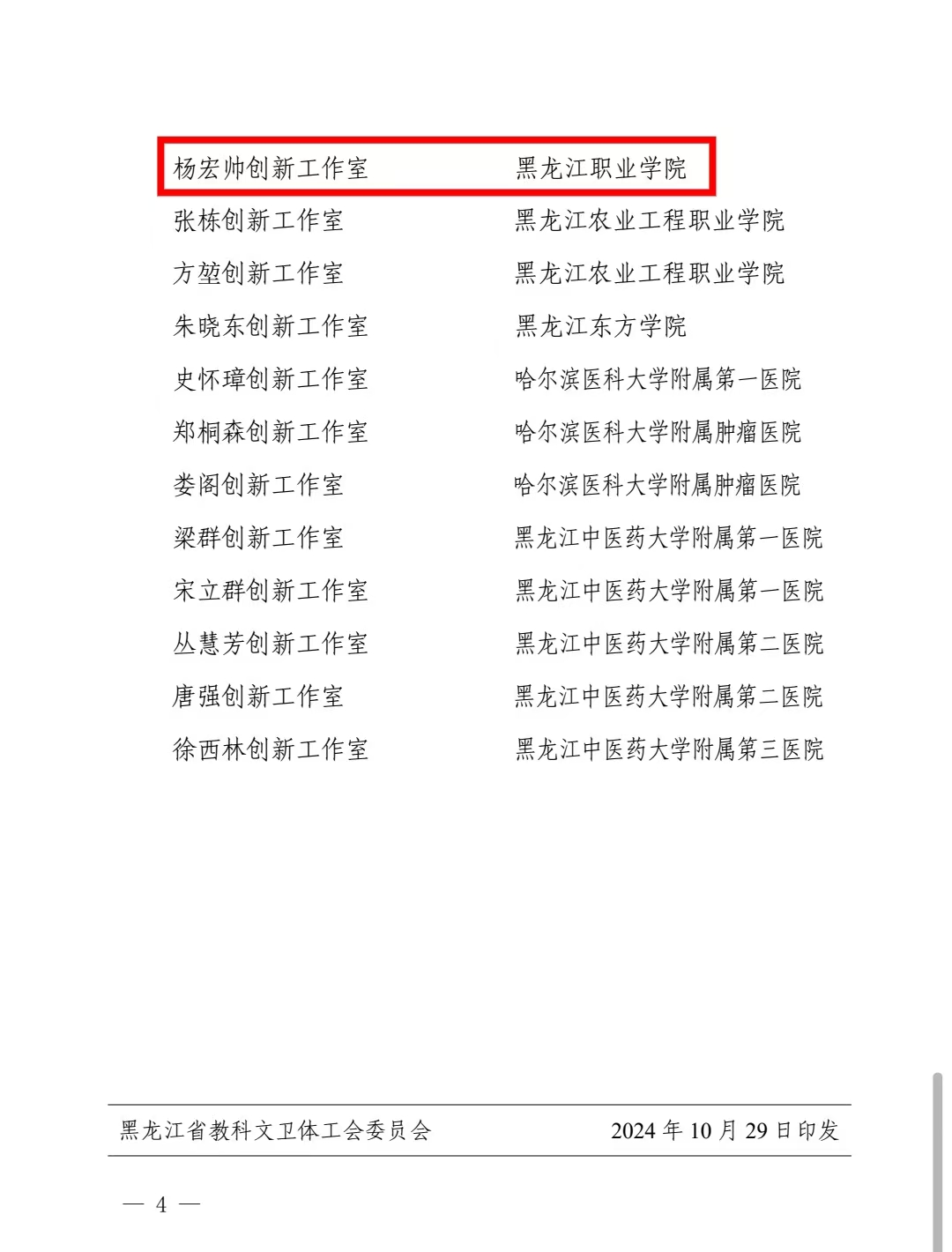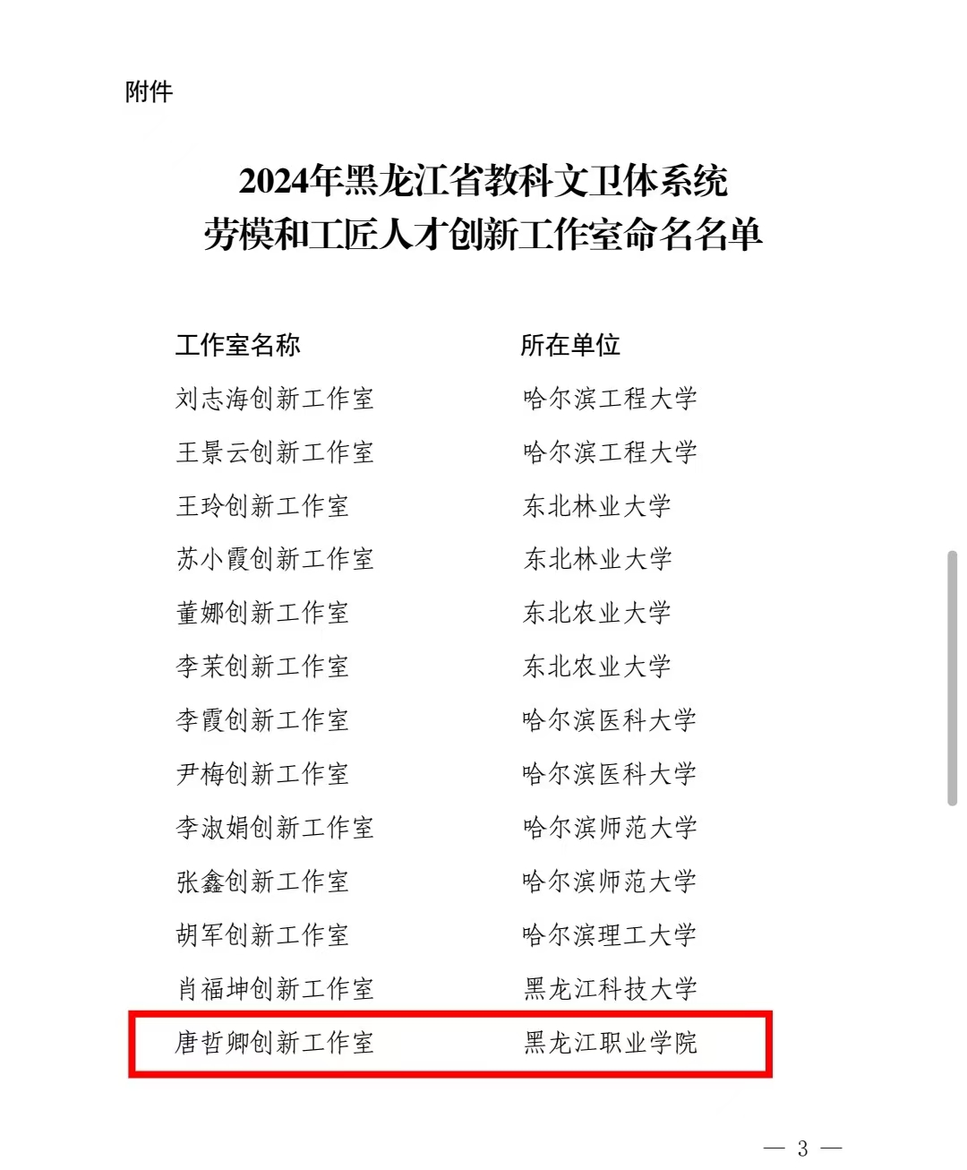 近日,省教科文卫体工会下发《关于命名2024年黑龙江省教科文卫体系统劳模和工匠人才创新工作室的决定》,全省共25个工作室获评省教科文卫体系统劳模和工匠人才创新工作室,KY开元官网唐哲卿创新工作室、杨宏帅创新工作室获此殊荣。