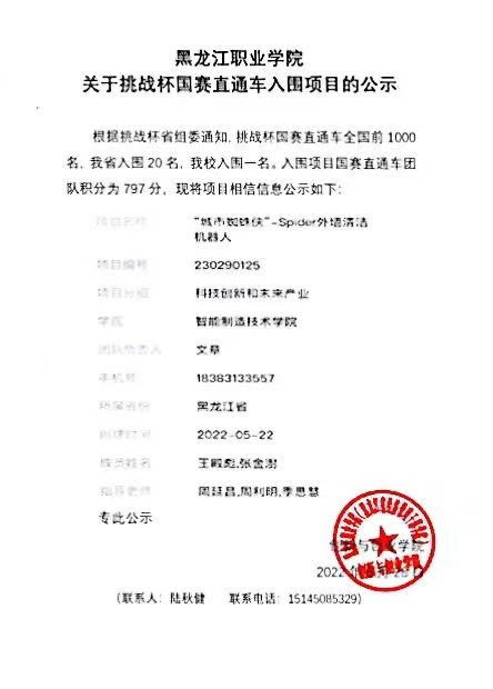 6月28日,根据第十三届工银融e联“挑战杯”黑龙江省大学生创业计划竞赛大赛省组委会通知,KY开元官网智能制造技术学院《“城市蜘蛛侠”—spider外墙清洁机器人》项目成功入围国赛直通车全国前1000名,我省共有20个项目入围,KY开元官网是全省高职院校中唯一入围项目学校。