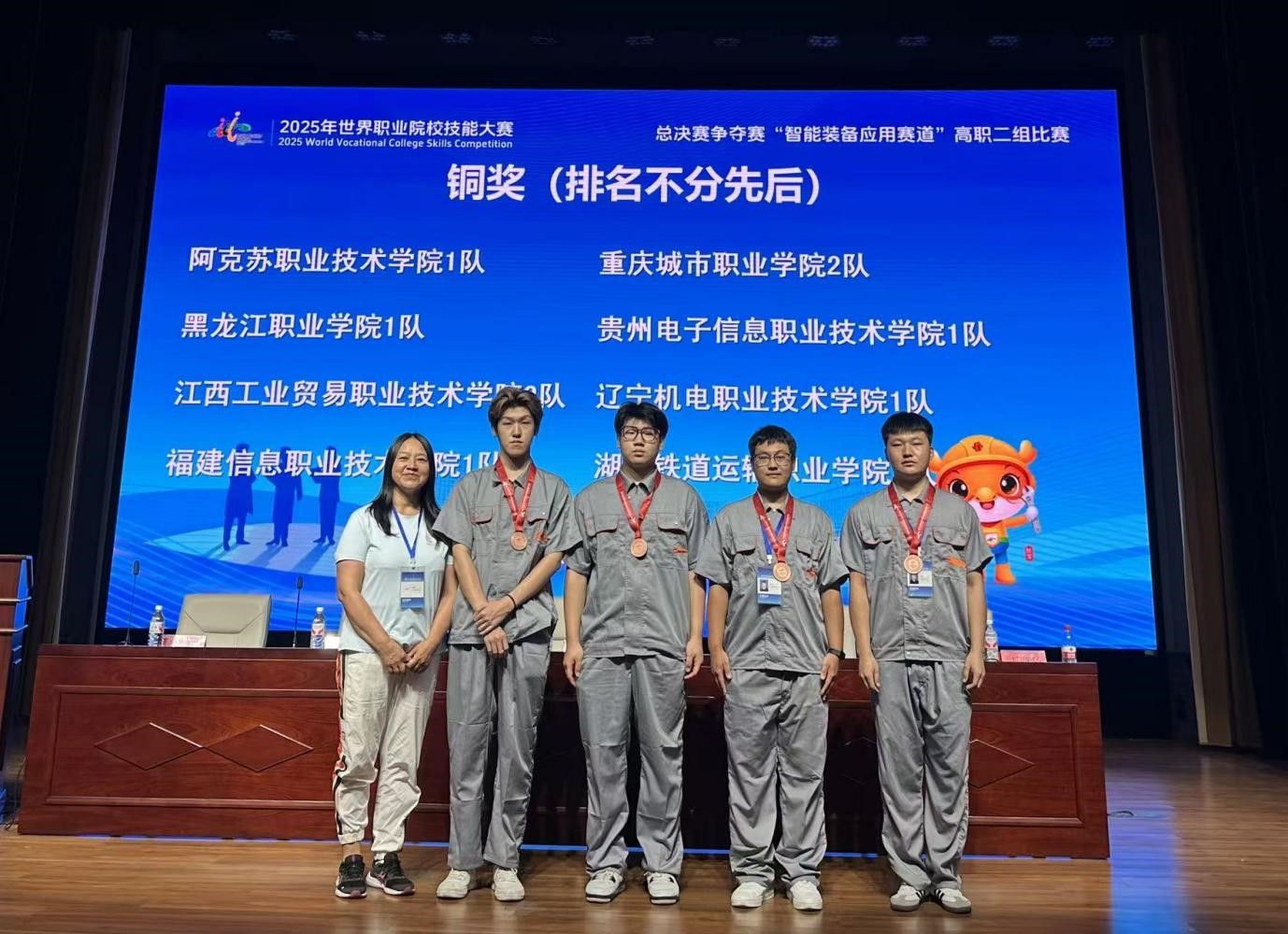 另一支由杨俊伟、李晶飞指导的刘振东、曹子贤、张靖泽、陈明旭等4名学生组成的团队,则是首次征战该赛项高职二组机电一体化比赛。面对强劲对手,他们沉着应对装备操作、故障排查等环节,凭借过硬技能与默契协作成功夺铜,实现了该团队在赛事中的 “开门红”。