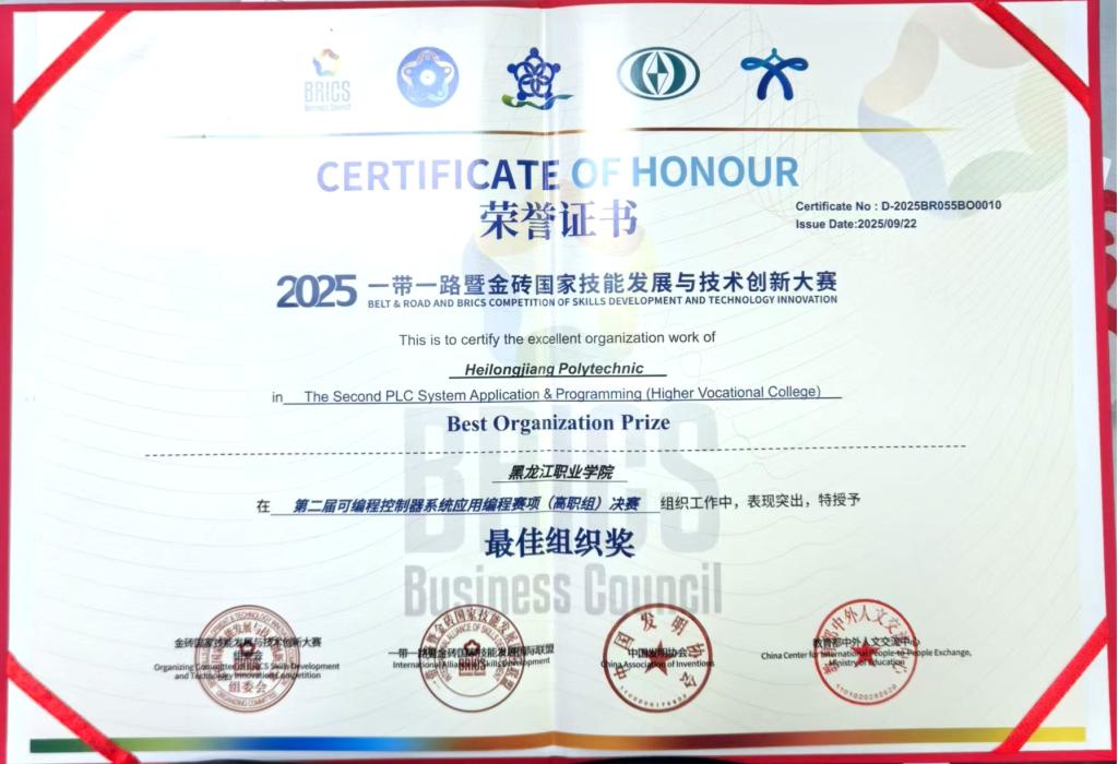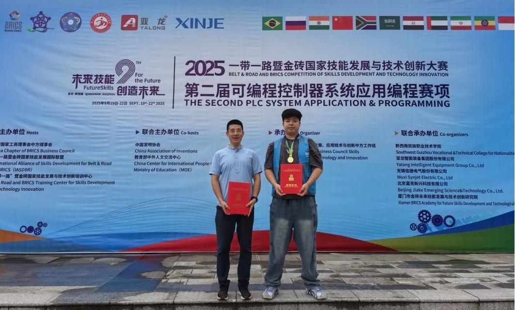 9月20日,2025年“一带一路”暨金砖国家技能发展与技术创新大赛第二届可编程控制器系统应用编程赛项在黔西南民族职业技术学院举办,来自136支高职院校队伍和41支中职院校队伍参加,通过理论和实践等环节比拼,智能制造技术学院徐伟老师指导的学生曲云辉凭借着扎实的技术功底,在众多选手中脱颖而出,全国排名第九,斩获金牌,实现KY开元官网在此赛事的新突破。大赛委员会为KY开元官网颁发了最佳组织奖,对KY开元官网组织备赛、参赛工作给予充分肯定。