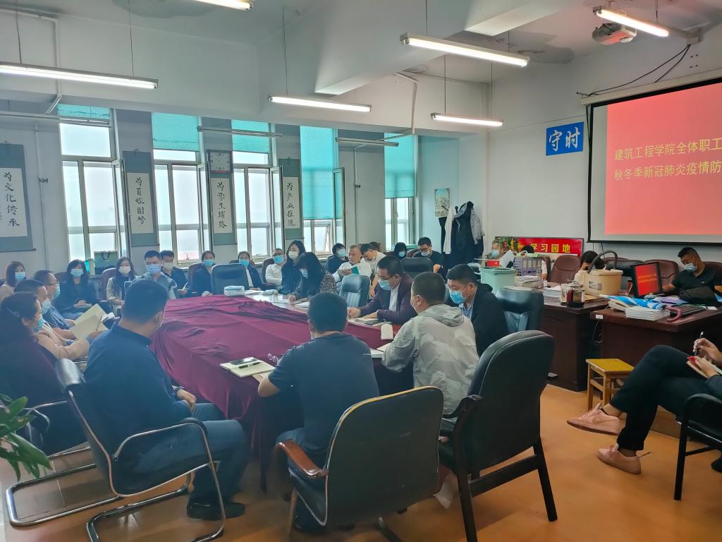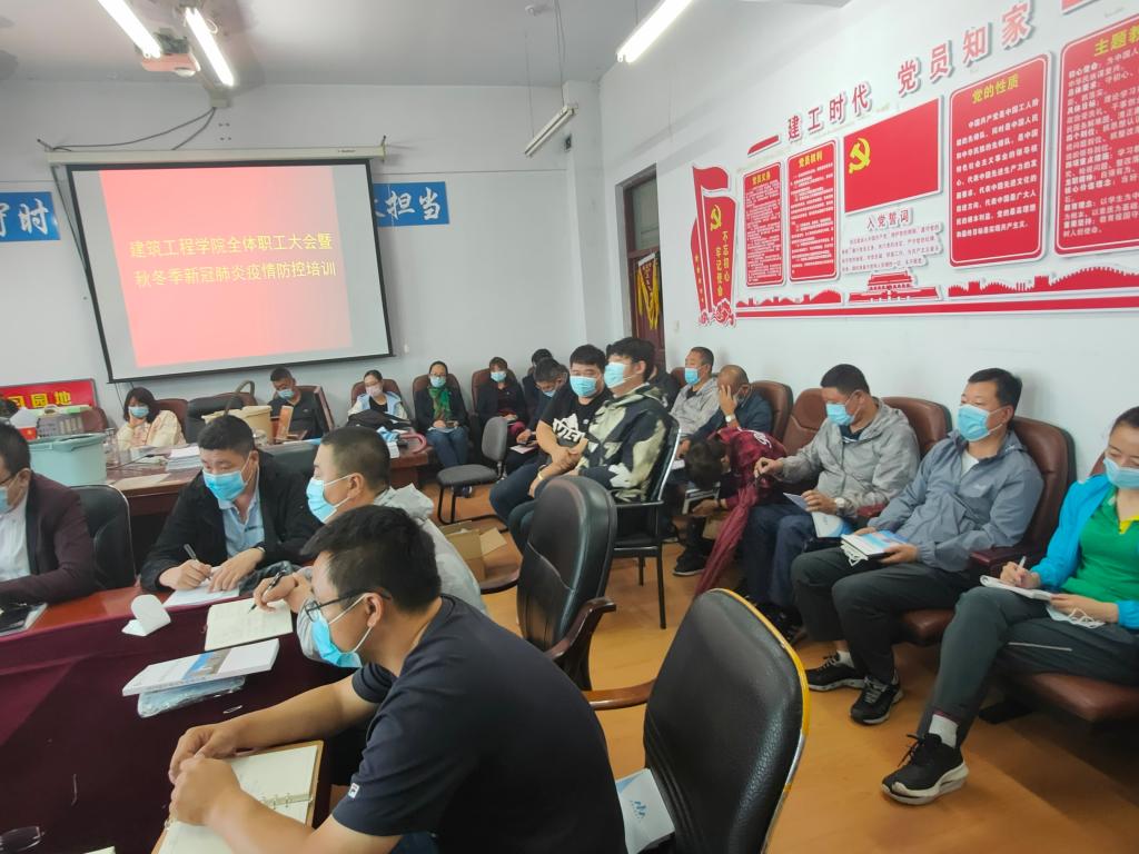 9月9日,建筑工程学院召开全体职工大会,会上院长范海波传达了学校党委书记赵继会和校长王利文在全校2020年秋季学期开学动员部署暨疫情防控培训大会上的讲话,布置各团队深入学习、贯彻落实讲话精神,严密部署了建筑工程学院秋冬季新冠肺炎疫情防控的各项工作,任务层层细化、责任落实到人,绝不能让来之不易的疫情防控成果前功尽弃。